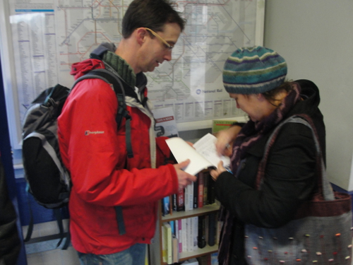After a few minutes in Wimbledon, it was then a quick hop by train to our final stop of the day, Raynes Park. Arriving there, we met with Chris Larkman, who has been maintaining the scheme since 2005, and was the inspiration for the Wimbledon swap, which in turn was what inspired the whole Books for London campaign. Having corresponded with Chris several times via email, it was great to finally meet him and talk about the fun and frustrations of running a station book swap. Chris signed our final FreedBook, and we released it onto the swap shelf at Raynes Park.